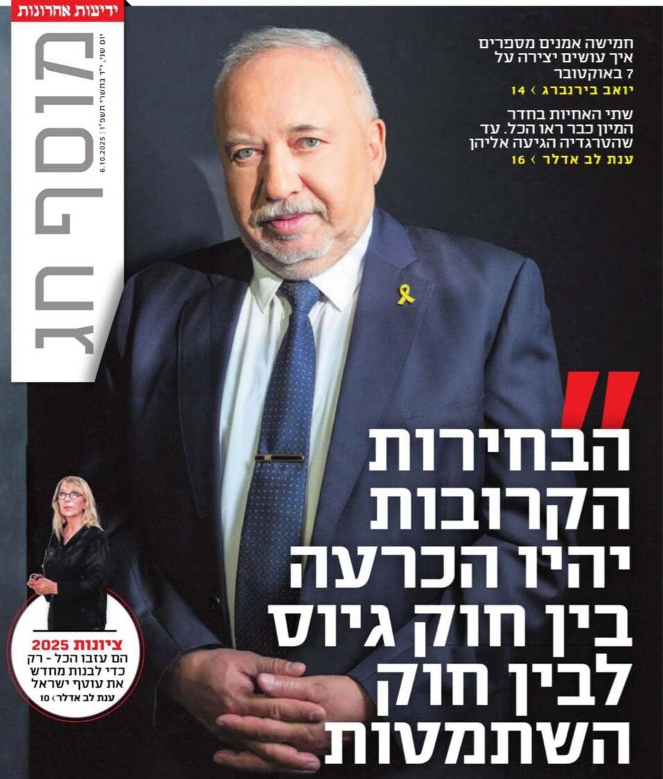 ליברמן מסמן יעדים ממוקדים לקראת הכניסה לשנת הבחירות. "יש לי שתי מטרות, וזה חייב להיות ברור. קודם כל להחליף את ממשלת 7 באוקטובר וממשלת ההשתמטות בממשלה ובקואליציה ציונית. דבר שני, להיות ראש ממשלה. בסדר הזה".